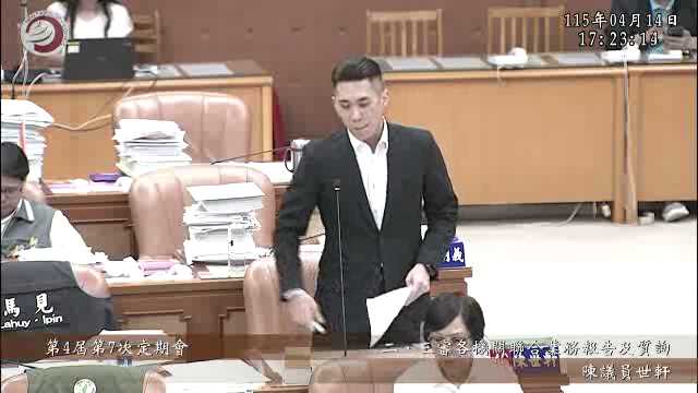 屆次會期:第4屆第7次定期會 議  程:二、三審各機關聯合業務報告及質詢-陳議員世軒 發言議員:陳世軒 開會日期:115-04-14 開始時間:17:22:54 結束時間:17:29:54