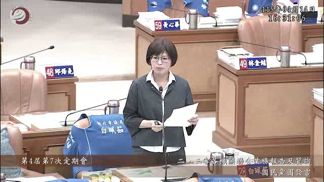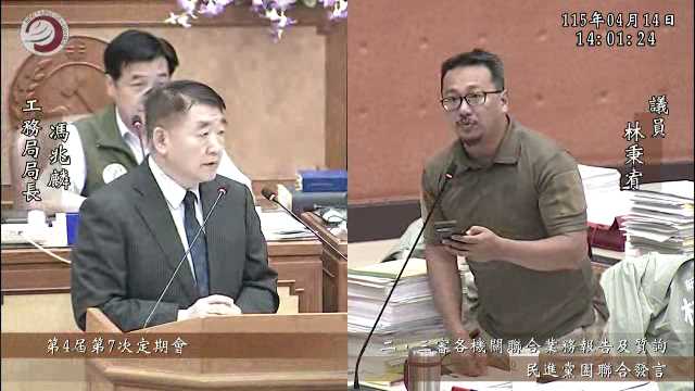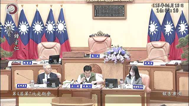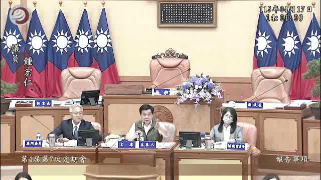 屆次會期:第4屆第7次定期會 議  程:報告事項 發言議員:黃淑君,鍾宏仁 開會日期:115-04-17 開始時間:14:00:40 結束時間:14:03:11