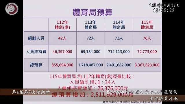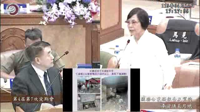 屆次會期:第4屆第7次定期會 議  程:二、三審各機關聯合業務報告及質詢-李翁議員月娥 發言議員:李翁月娥 開會日期:115-04-14 開始時間:17:16:45 結束時間:17:22:55