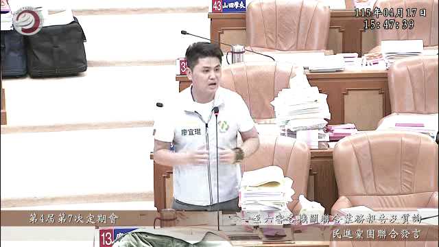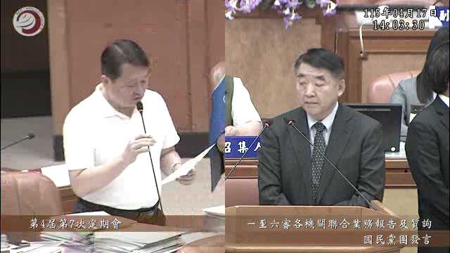 屆次會期:第4屆第7次定期會 議  程:二、三審各機關聯合業務報告及質詢-國民黨團發言 發言議員:白珮茹,金瑞龍,陳偉杰,黃永昌,蘇泓欽 開會日期:115-04-14 開始時間:16:30:45 結束時間:17:16:47