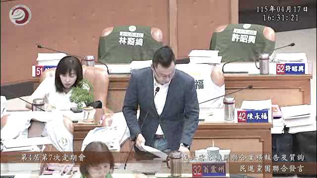屆次會期:第4屆第7次定期會 議  程:一至六審各機關聯合業務報告及質詢-民進黨團聯合發言 發言議員:石一佑,李余典,李倩萍,林銘仁,翁震州,鍾宏仁,蘇錦雄Paylang.Caya 開會日期:115-04-17 開始時間:16:31:01 結束時間:17:31:43